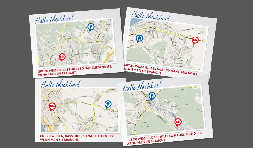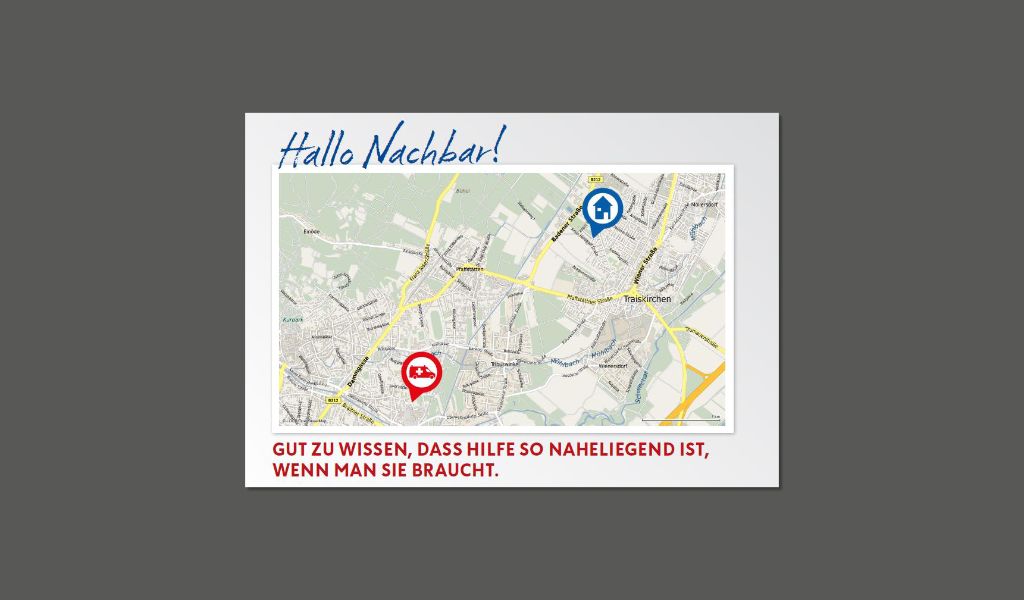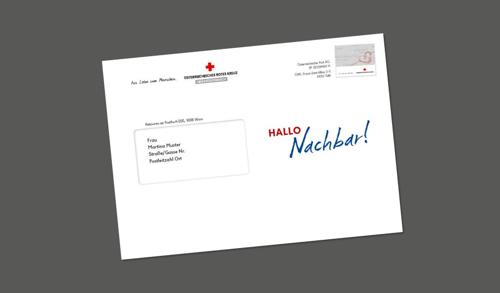Alle Empfänger*innen des Schreibens vom ROTEN KREUZ bekommen – mit der Aktion „Hallo Nachbar“ – eine ganz persönliche, individuelle Landkarte. Diese zeigt, wo sich die nächste ROT KREUZ-Stelle im eigenen Umfeld befindet. Man weiß dadurch, wo schnelle Hilfe zu finden ist und an wen man sich wenden kann, wenn es um weitere Dienstleistungen wie z.B.: Blutspenden oder Erste-Hilfe-Kurse geht. Getestet wurde diese Idee im Juni, September und Oktober in der Steiermark, dem Burgenland und Niederösterreich. Damit ist ein Zufallsbefund ausgeschlossen.